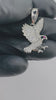 The Moissanite Eagle Pendant features a striking eagle design adorned with vibrant red eyes, crafted from 18k white gold over premium silver. The use of moissanite provides superior brilliance and durability, making it an excellent choice for enduring elegance. This pendant offers an artistic representation paired with high-quality materials for long-lasting wear.